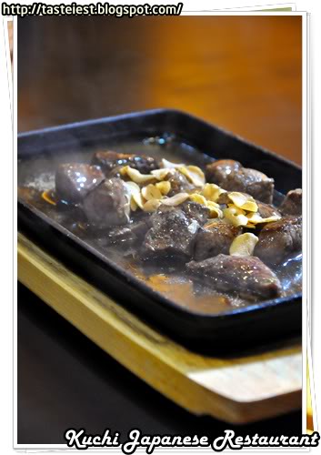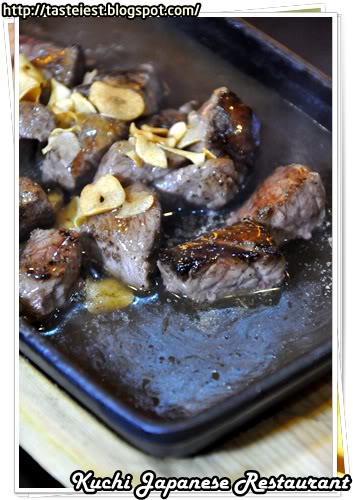 Saikoro Steak RM24, beef cube cook in hot plate garnish with deep fried slice garlic. A dish that must be consume immediately after served else the hot plate will overcook beef.