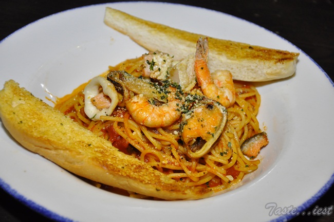 Seafood Spaghetti RM 35.00, assorted fresh seafood simmered in homemade fresh tomato. Served on a bed of buttered spaghetti and garlic toast. Rich flavor tomato paste mix with spaghetti and fresh seafood, garlic toast is crunchy and surprisingly match with the spaghetti.