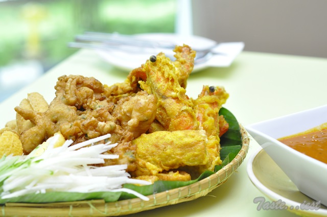 Penang Famous Pasembur, it is a Malaysia style of Salad that consist of assorted vegetable such as potato, cucumber, turnip and bean sprouts, while on the main ingredients it consists of prawn fritters, spicy fried crab and spicy fried prawn. The taste of the Pasembur is sweet with mild seafood flavour, it has very great taste and crunchy texture.