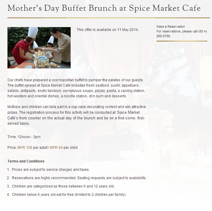 Enjoy Mother’s Day Buffet at Spice Market Cafe Shangri-La’s Rasa Sayang Resort & Spa Penang. RM128 adult and RM64 Child.