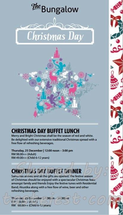 The Bungalow Christmas Day Buffet Dinner and Lunch at Lone Pine Hotel, pricing for Christmas eve is RM98++ Adult RM49++ Children while Christmas Day RM138++ Adult RM68++ Children.