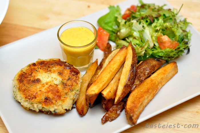 Nyonya Fish Cake with Hand Cut Chips RM15, serving the fish cake with fresh salad and a cup of Aioli sauce. The fish cake is created with various type of spices and it has some solid bite with great flavor.
