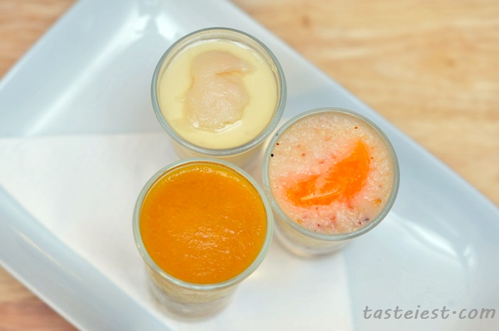 Chilled Cheese Mango, Lychee and Orange Lychee in cup.