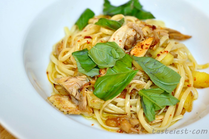Caramelized Mango and Chicken Linguine, Olive Oil, Chili and Basil RM18. Pan seal mango with flavorful chicken breast cook with olive oil and chili flake top with basil. It has sourish and sauteed taste that is very appetizing.