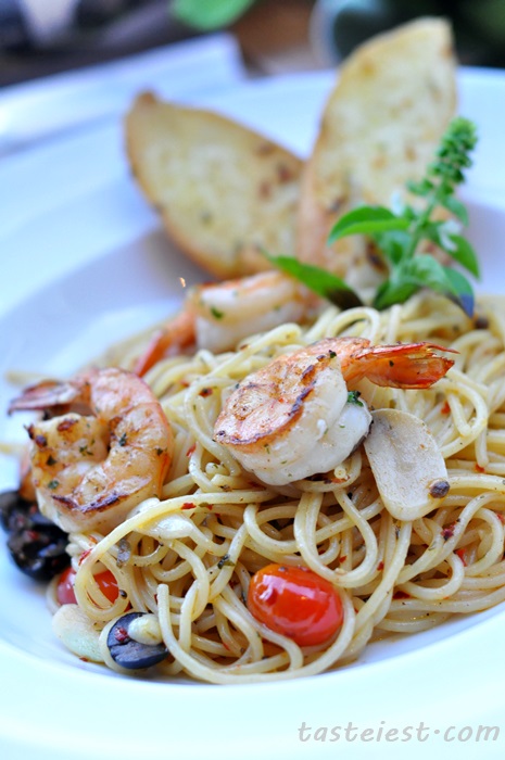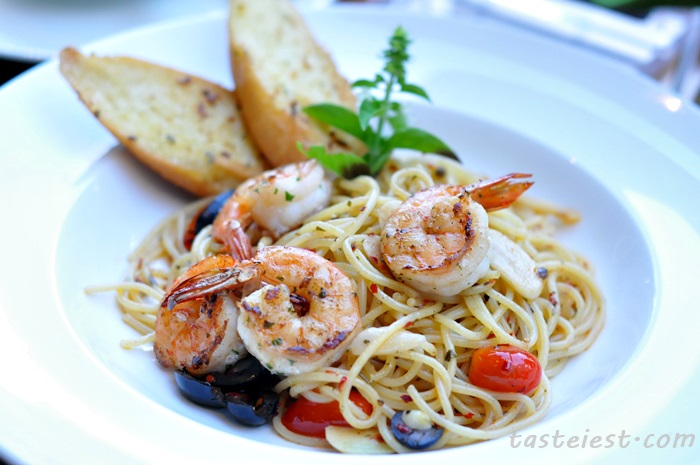 Spaghetti Aglio Olio with garlic bread, prawn, tomato, olive, chili flake and slice garlic. Spaghetti is el-dente, it taste light with great olive aroma.