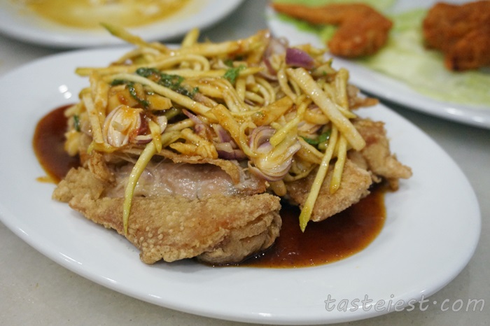 Mango Chicken RM15, deep fried crispy chicken top with slice mango, shallot and chili padi.