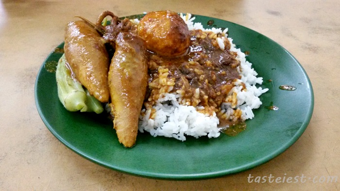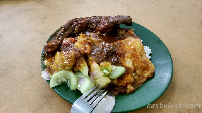 I had one whole big drumstick, fried egg and pickle vegetable, the chicken is deep fried then dip with sweet herb sauce that has crispy texture and taste sweet, topping of assorted curry making it taste so good.