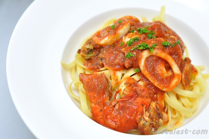 Seafood Spaghetti cook in tomato sauce with prawn and squid.
