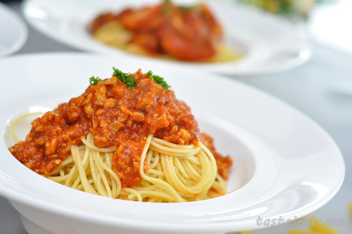 Bolognese Spaghetti cook with chicken meat onion and tomato sauce.