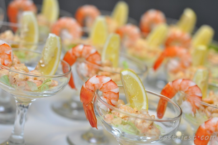 Prawn Cocktail with a slice of lemon and many small shrimp in salad.