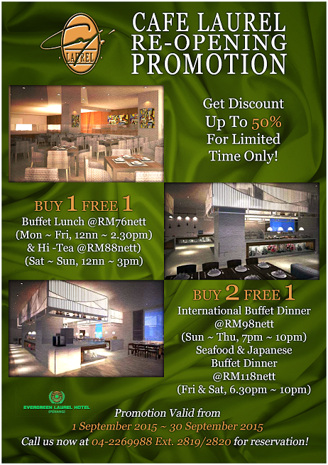 We got an exciting news to share in regards to the Re-opening promotion from Cafe Laurel, Buy 2 Free 1 Dinner Buffet for just RM118nett per person. Promotion valid till end of October 2015.