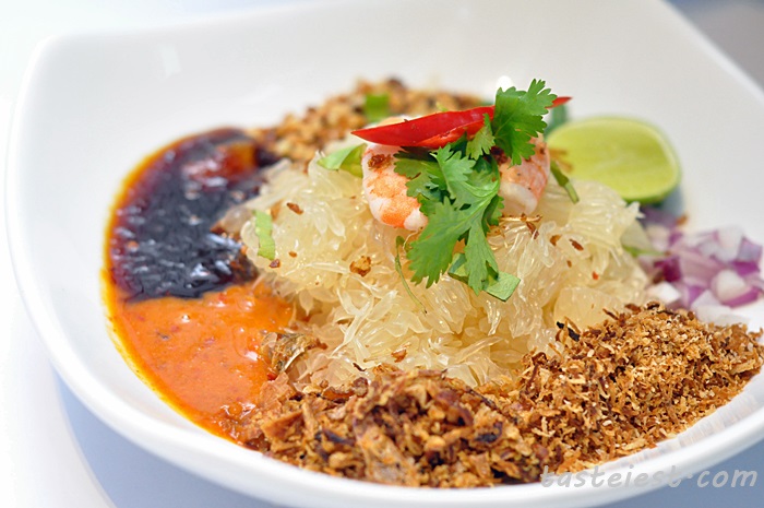 Yum Som Orr (Pomelo Salad), a tangy salad that surprise all of us. Great use of Pomelo to replace green papaya since Pamelo has the “pop” texture instead of papaya crunchy texture which has better texture and flavor, season with deep fried shallot, onion, peanut, spring onion and lime with sweet and spicy sauce is just awesome.