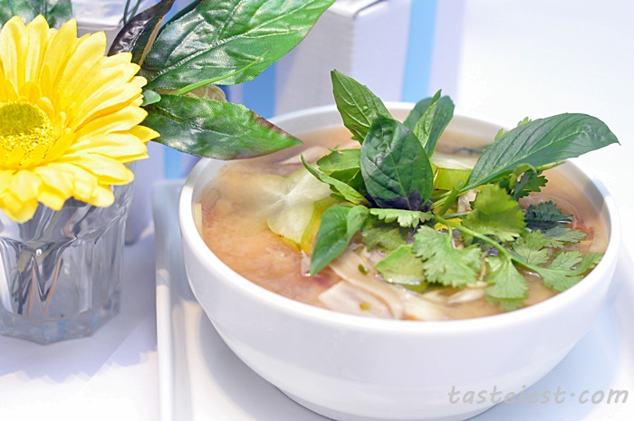 Tom Som Seafood, a combination of clear galangal, lemongrass, lime soup and Thai herbs served with seafood. Immediate after a spoonfuls of the soup we can feel the spicy and sour taste, it is pretty strong in flavor and inside the bowl of soup are squid, fish meat and prawn.