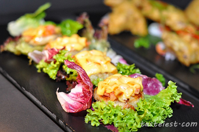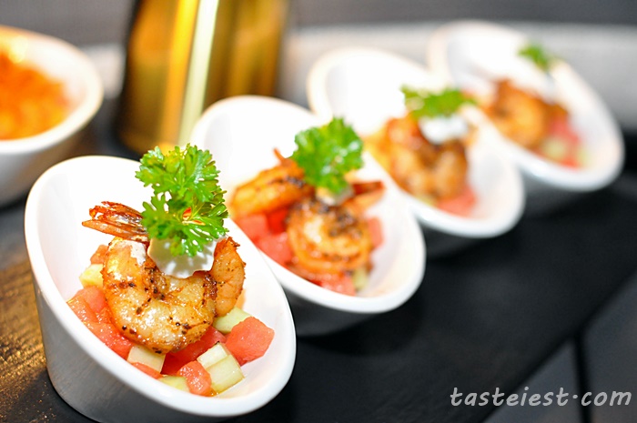 Prawn & Watermelon Salsa RM19, nicely plated snack that has deep fried prawn served in a pool of watermelon. Prawn are season to flavor and eating with cold watermelon taste refreshing.