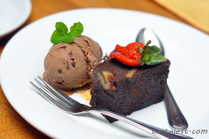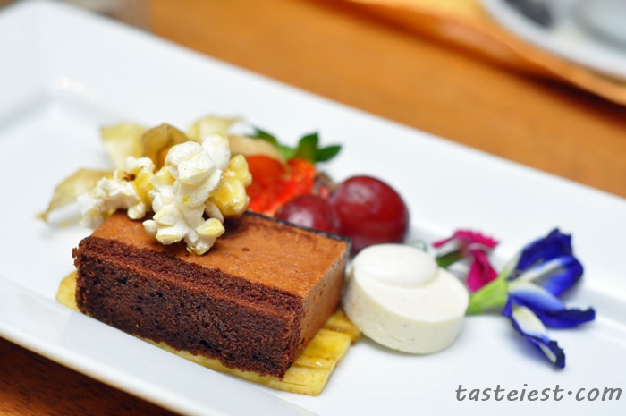 Chocolate Mousse Cake with Caramelized Banana, Coconut Gelee, Pop Corn & Berries. You have to cut through the cake and caramelized banana then eat together to have the special flavor, chocolate has very strong flavor while banana neutralize the bitter taste of chocolate to create a balanced flavor.