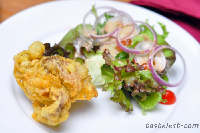 Arugula Salad (Beef Bacon, Tempura Oyster Sauce, Toast Hazelnut, Balsamic reduction vinaigrette). The beef bacon is extremely crispy and eating with assorted fresh crunchy vegetable is just nice.