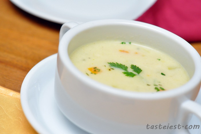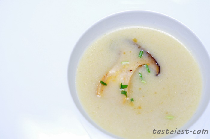 Chicken veloute with Poached Breast, Eryngii Mushroom & Chive. A very fine soup with mild mushroom flavor in chicken stock.