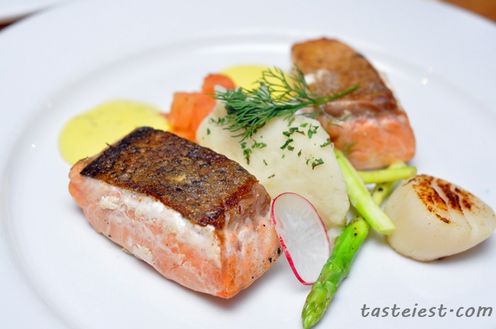 Pan Seared Norwegian Salmon, two big portion of Salmon pan grilled to perfection, the Salmon skin is very crispy while the fish meat retain the fish oil fragrance.