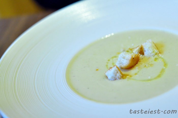 Cream of Cauliflower drizzle with extra virgin olive oil and croutons. It taste creamy with a little bit of salty taste and cauliflower sweetness, it is balanced in flavor and taste good.
