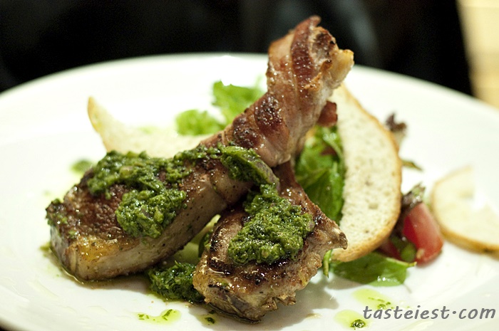 Bacon Wrapped Lamb Rack, Lamb Rack nicely pan fried to crispy outer layer then wrapped with bacon and oven roasted to perfection. Topping with sauce verde anchovy (green herb). The add on bacon wrapped gave lamb rack a boost of flavor, both mix well and create a strong flavor dish. One more please!