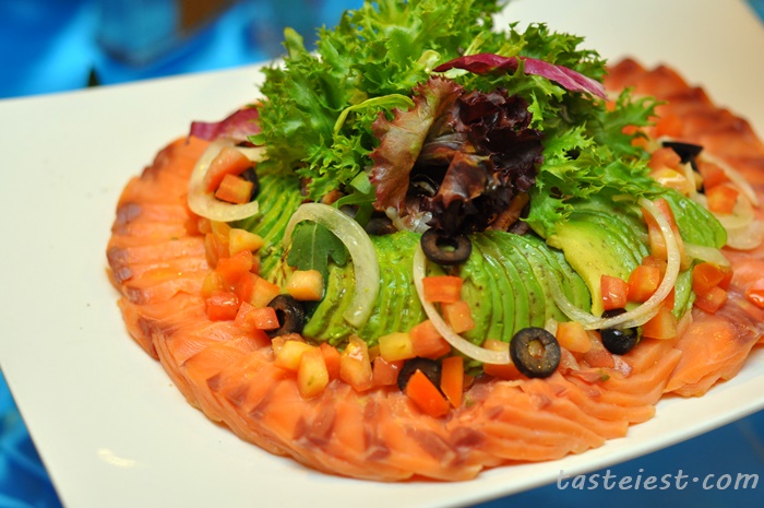 While on appetizer, Smoked Salmon Salad with Avocado, Onion, Olive, Tomato and Lettuce.