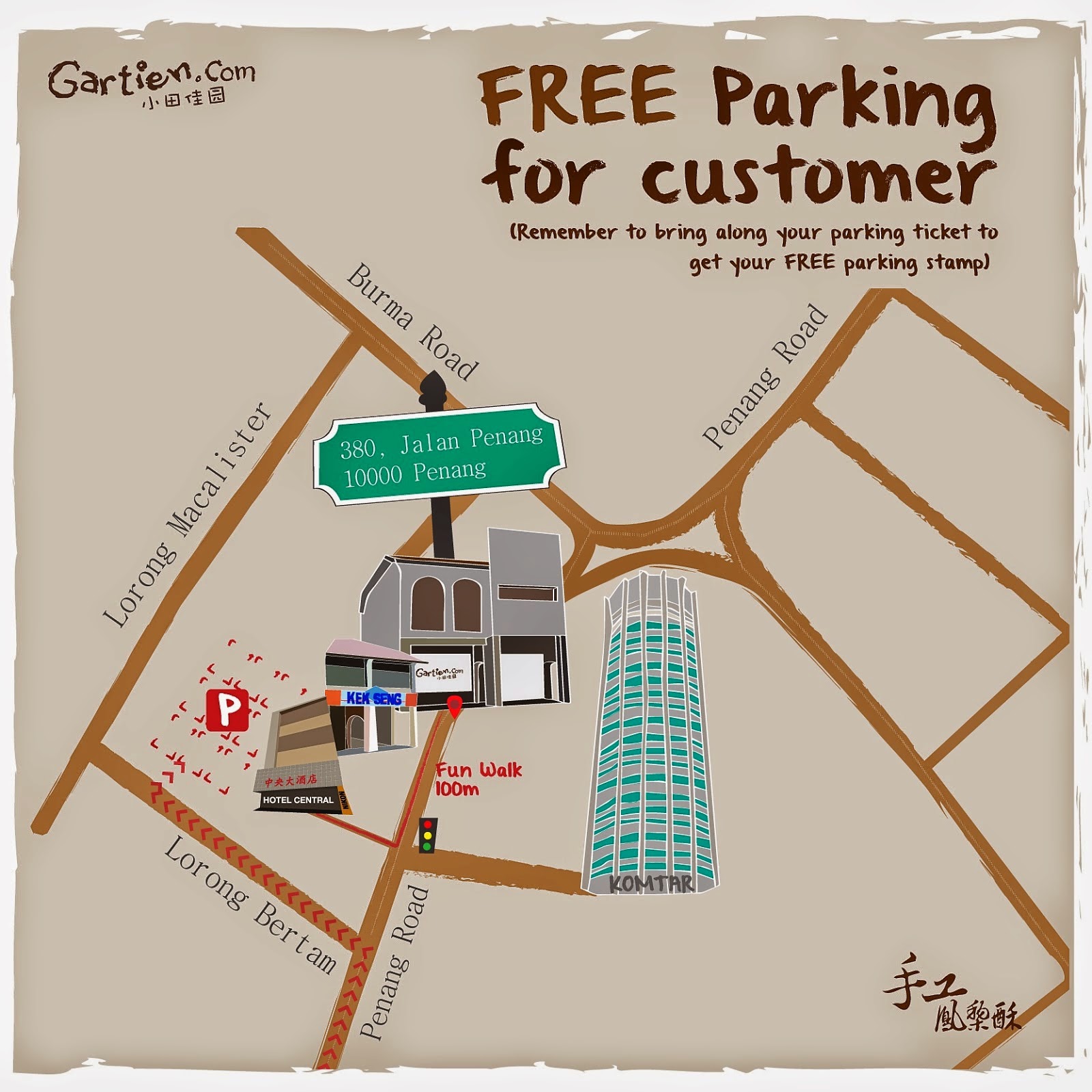 Gartien has move to a much more strategic location at Jalan Penang (Beside Kek Seng Coffee Shop, same row as Komtar Bus Station). Now tourist can easily spot their shop and for those tourist taking public transportation can just stop at Komtar and walk over which is very convenient. For local who drive may give them a call and you can stop in front their shop for a quick pick up.