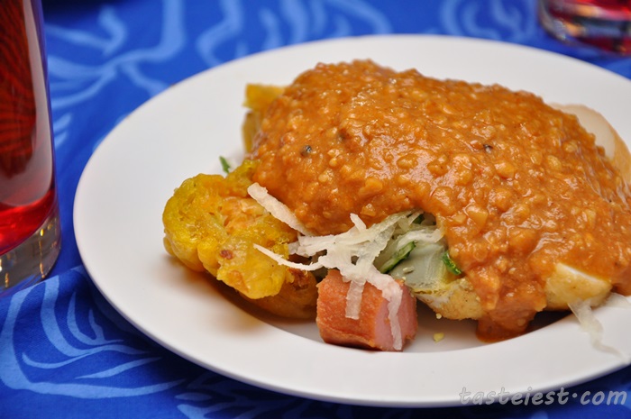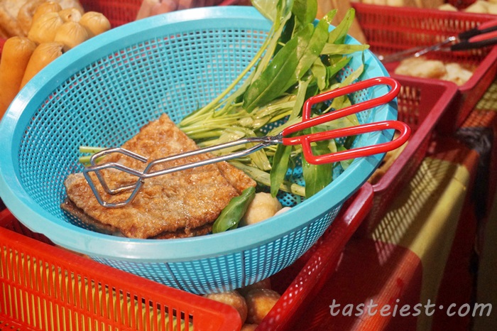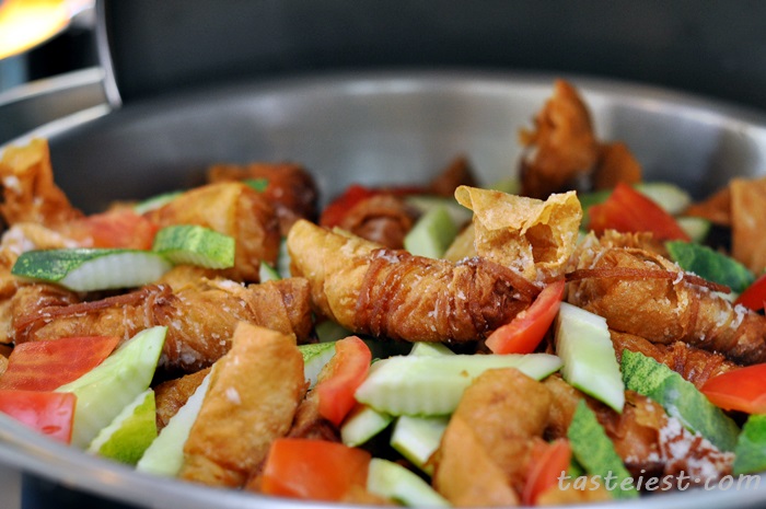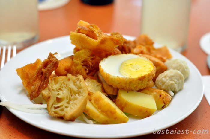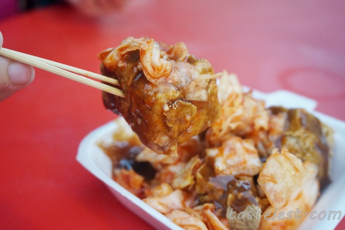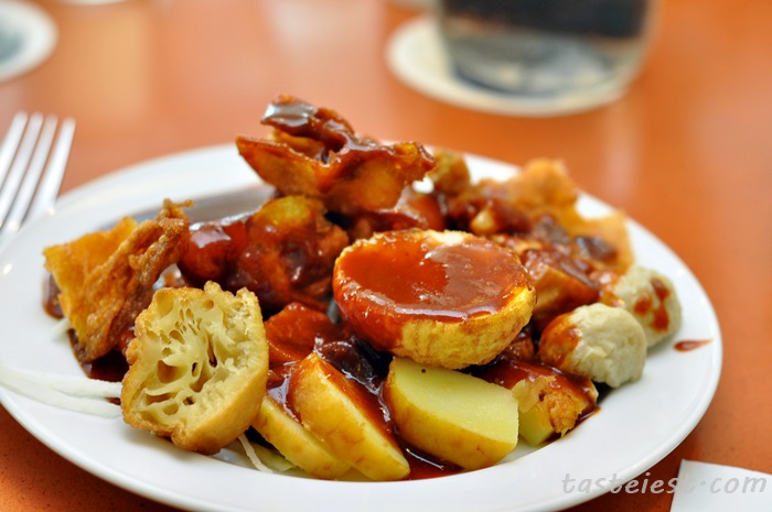Malaysia delicacy Pasembur, you can mix and match your favorite Pasembur ingredients such as tofu, prawn cracker, egg, cucumber…etc with the spicy and sweet sauce.