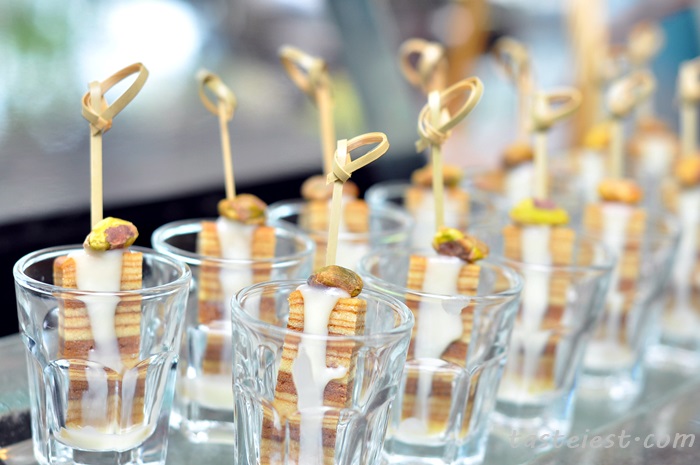 Layer cake cut into small size that is good idea for buffet, we can really enjoy the one bite dessert and have room for other desserts.