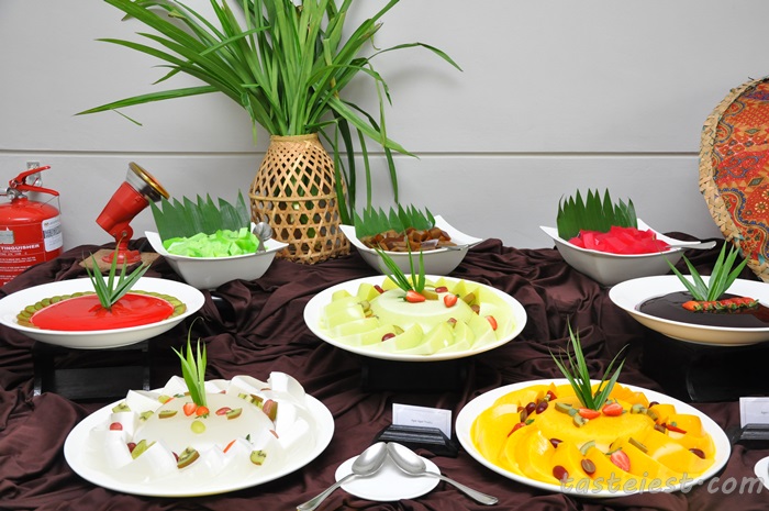 Pencuci Mulut (Desserts): Bubur (Bubur Kacang, Bubur Pulut Hitam, Pengat Pisang) Aneka Kek Tradisional, Aneka Agar-agar Tradisional, Aneka Pudding, Aneka Jelly, Aneka Kuih Tradisional, Sagu Gula Melaka, Leng Chee Kang, Aneka Ais Krim (Pilihan Ais Krim Vanilla, Coklat, Jagung, Keladi & Strawberry)