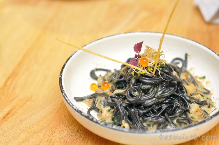 Spaghetti con pencetta RM23, Spaghetti tossed in olive oil, garlic, onion, black pepper, black olive, cherry tomato, mushroom, smoked bacon, chorizo oil, italian parsley, drizzle of extra virgin oil and topped with Grana Padano Cheese. Spaghetti cook to el-dente texture and with so many ingredients it create a rich and flavorful taste, smoked bacon play a key role as it gave a salty flavor that enhance the overall flavor.